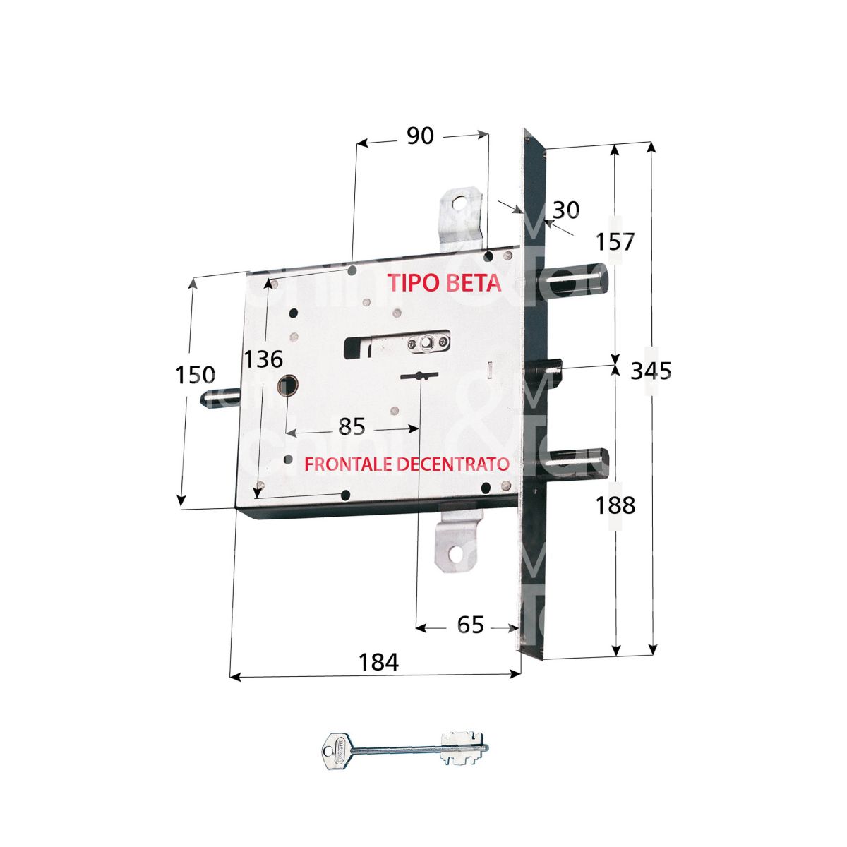 SERRATURA DOPPIA MAPPA " TIPO BETA" INFILARE TRIPLICE 4 Mandate e scrocco azionato da quadro maniglia e chiave Piastra frontale mm. 345x30 aste non comprese