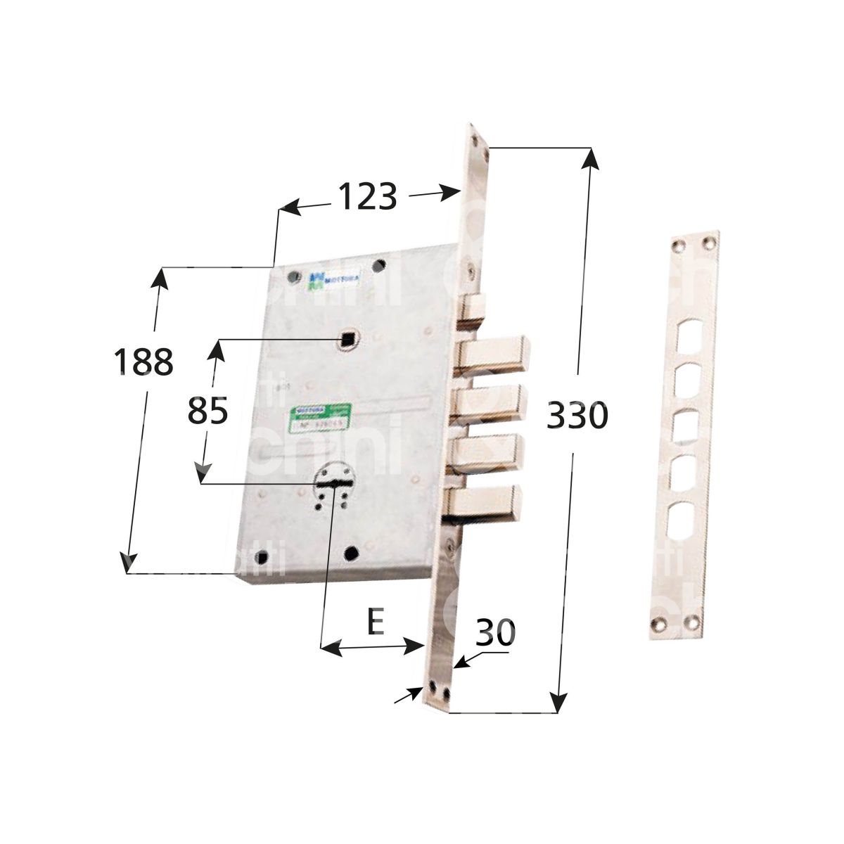 SERRATURA LATERALE AD INFILARE DOPPIA MAPPA Con mezzo giro azionato da chiave e maniglia con quadro 8 Corsa chiavistello 36 mm Mezzo giro reversibile 3 chiavi testa nera (gambo 36 mm) Mostrina interna ed esterna Ferrogliera