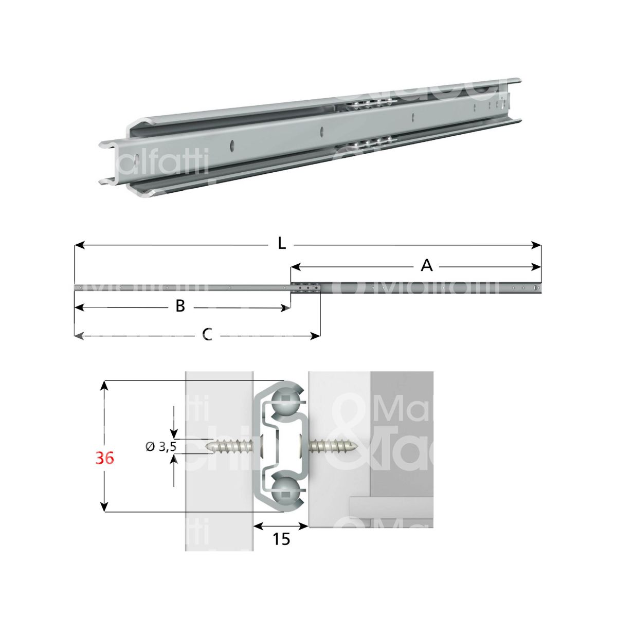 GUIDA A SFERE PER CASSETTO SERIE 351 Fissaggio laterale/orizzontale Estrazione parziale Portata max coppia 40 Kg La portata massima si riferisce al carico massimo consentito per coppia di guide (550 mm) con montaggio laterale Sezione C = 36 mm Foratura passo 32 mm Viti Ø 3,5 mm Finitura zincata