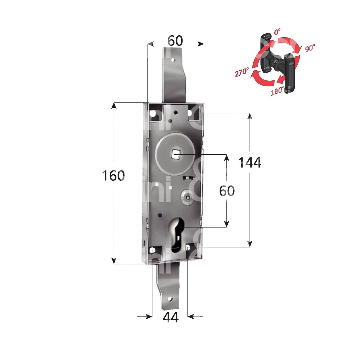 SERRATURA PER PORTE BASCULANTI Q.8 INTERASSE 60 La maniglia gira in folle quando si estrae la chiave e rende impossibile forzare la serratura Cilindro sagomato non incluso