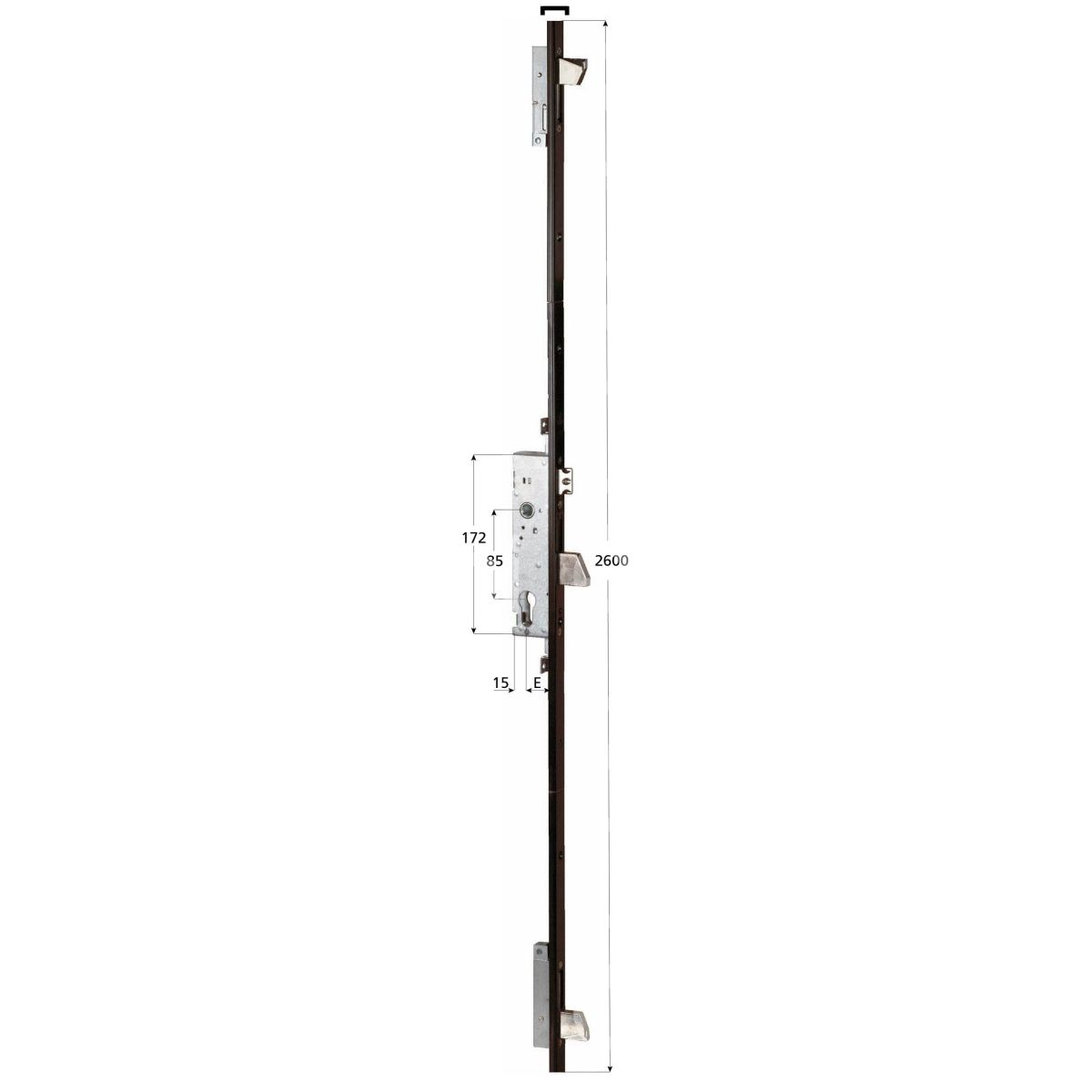 SERRATURA INFILARE Multipunto a cilindro Ambidestra 1 mandata Scatola in acciaio zincata Scrocco e catenacci nichelati Frontale rasabile ad "U" 24x7 in acciaio verniciato nero Altezza 2600 mm Rasab. sup 650 mm Rasab. inf. 150 mm 3 catenacci laterali Scrocco regol. da 11 a 17 mm Cilindro non incluso