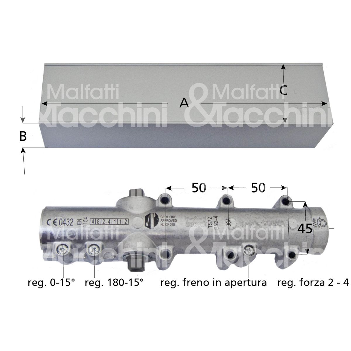 CHIUDIPORTA TS 72 SOLO CORPO per porte largh. max 1100 - 2 velocità di chiusura con valvole indipendenti freno in apertura regolabile Braccio non incluso da ordinare a parte