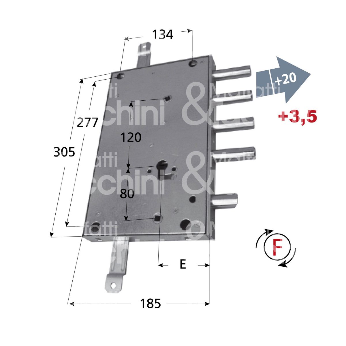 Scrocco reversibile azionato da cilindro e quadro maniglia inferiore Fissaggio serratura con 4 dadi in gabbia M6 sui lati