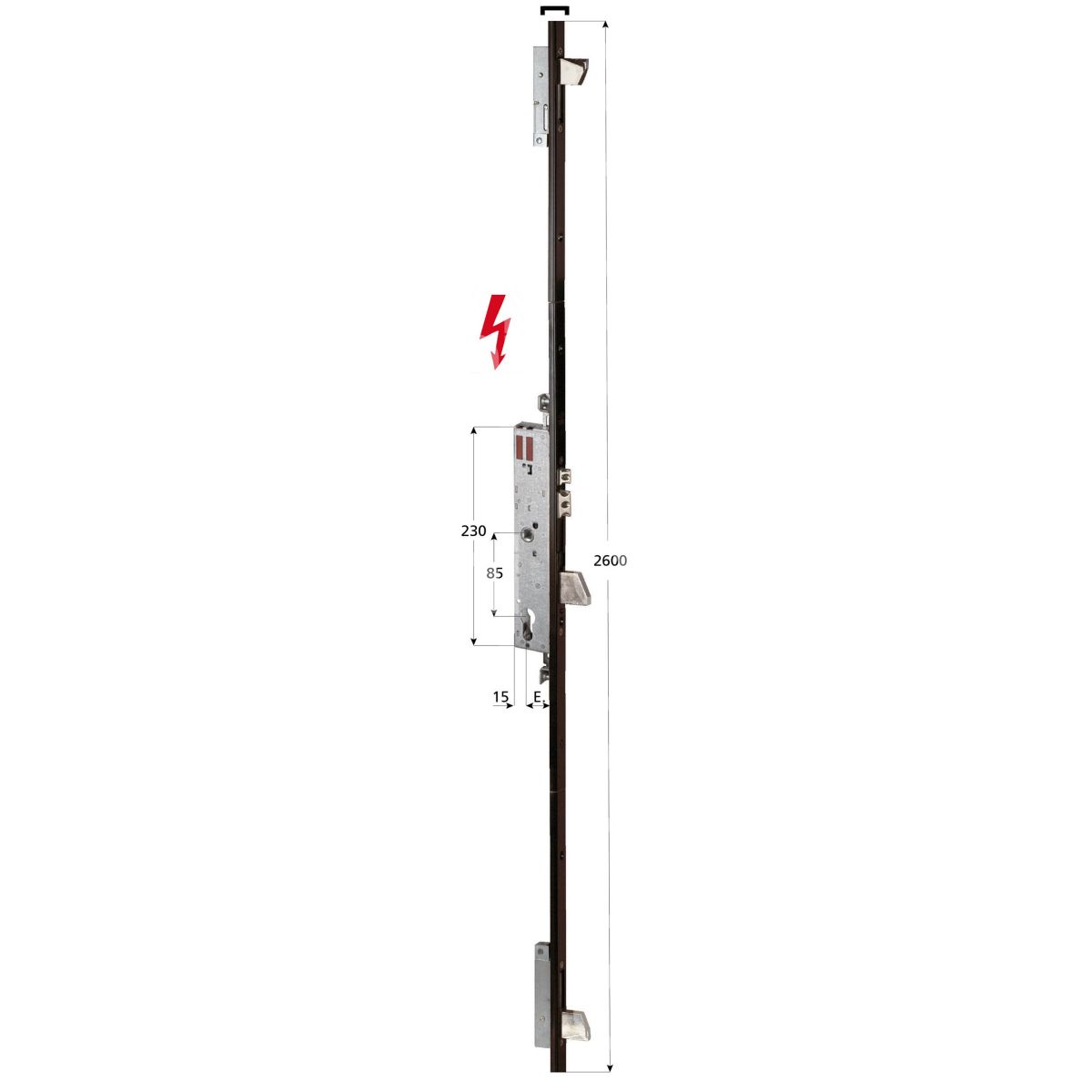 ELETTROSERRATURA INFILARE Multipunto a cilindro 12V ca Ambidestra 1 mandata Scatola in acciaio zincata Scrocco e catenacci nichelati Frontale rasabile ad "U" 24x7 in acciaio verniciato nero Altezza 2600 mm Rasab. sup 650 mm Rasab. inf. 150 mm 3 catenacci laterali Scrocco e pistone regol. da 10,5 a 16,5 mm Cilindro non incluso