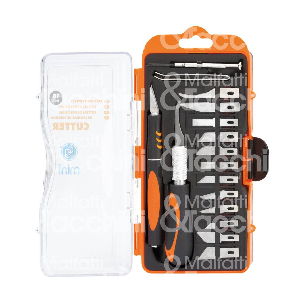 KIT 18 PZ. CUTTER PRECISIONE Impugnatura bi-materiale antiscivolo con attacco rapido delle lame Contiene: -14 lame assortite -1 cacciavite -1 pinza