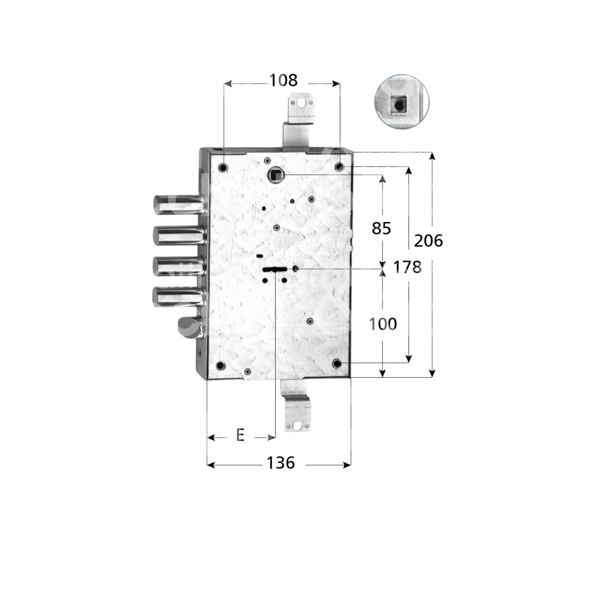 SERRATURA MONOSISTEMA DOPPIA MAPPA Serie M Applicare 4 mandate e scrocco reversibile Fissaggio con fori passanti e dadi in gabbia 3 chiavi 500110 Aste non comprese