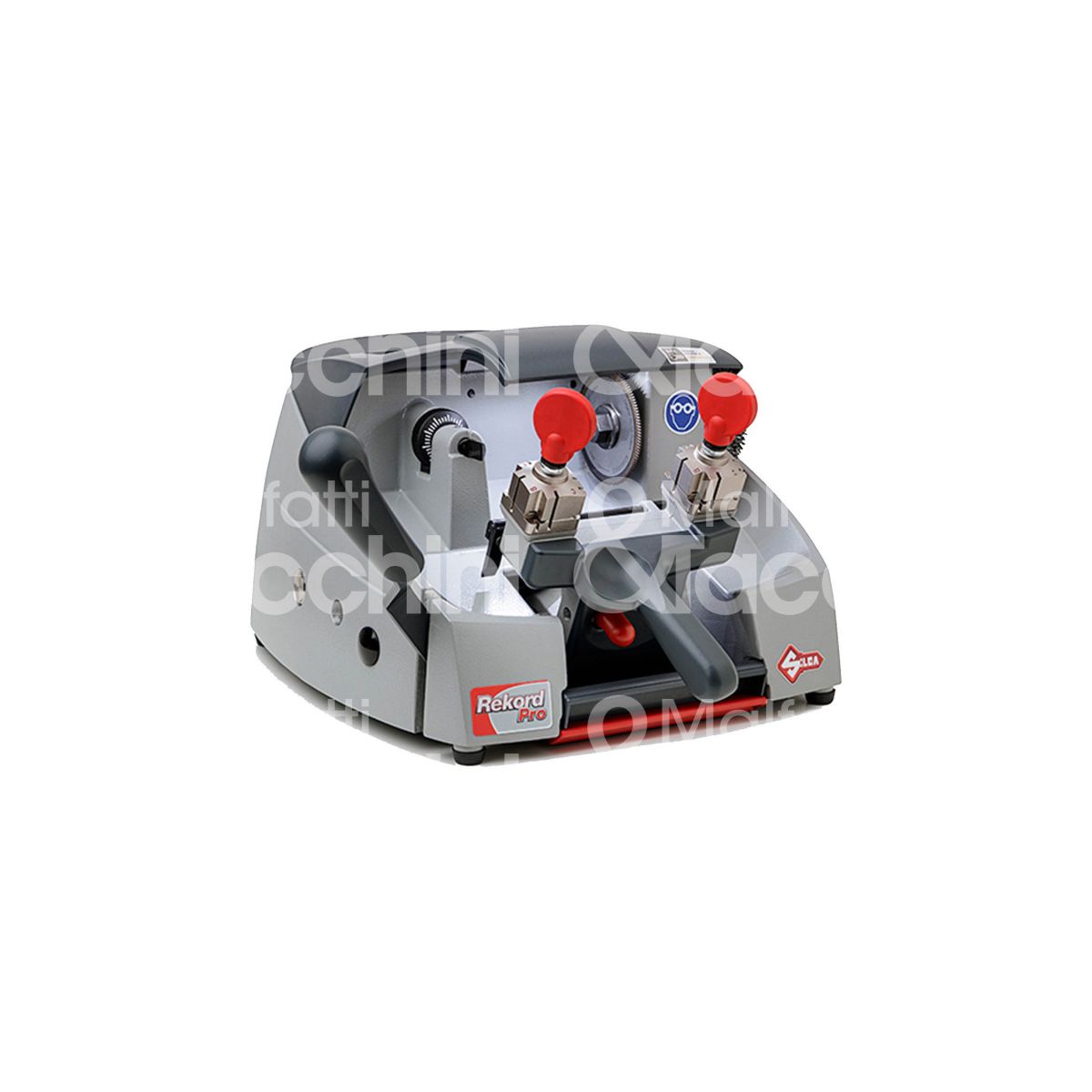 MACCHINA DUPLICATRICE REKORD PRO Duplicatrice meccanica per chiavi piatte e a croce Caratterizzata da morsetti a quattro lati dotati di manopole ergonomiche, tastatore meccanico con regolazione micrometrica Alimentazione: 230V-50/60Hz - 440W 2A Fresa: HSS (acciaio super rapido), rivestita in TiAlN Velocità fresa: 1350/1620 giri/min Morsetto: girevole a 4 lati Movimenti: tramite ingranaggio e albero carrello rettificato Dimensioni: Larghezza: 330 mm (con ingombro leva: 510 mm), Profondità: 430 mm, Altezza: 270 mm Peso: 19 kg