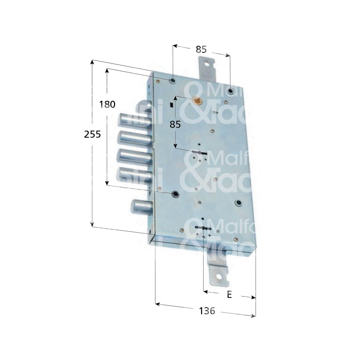 SERRATURA PLURIFUNZIONE PER BLINDATE Applicare Triplice Ambidestra Con blocco di sicurezza Serratura superiore 4 mandate e scrocco reversibile Serratura inferiore 2 mandate Aste non comprese
