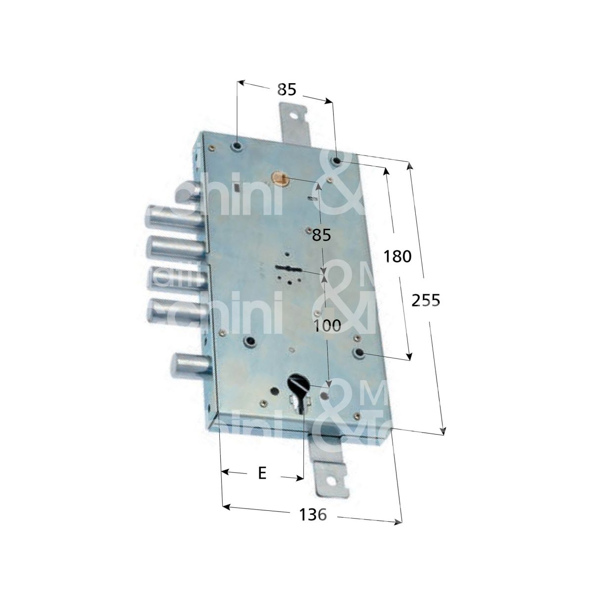 SERRATURA PLURIFUNZIONE PER BLINDATE Applicare Triplice Serratura DM 4 mandate e scrocco reversibile Serratura Cilindro 2 mandate Le due serrature azionano lo scrocco e sono indipendenti Aste non comprese Cilindro non incluso