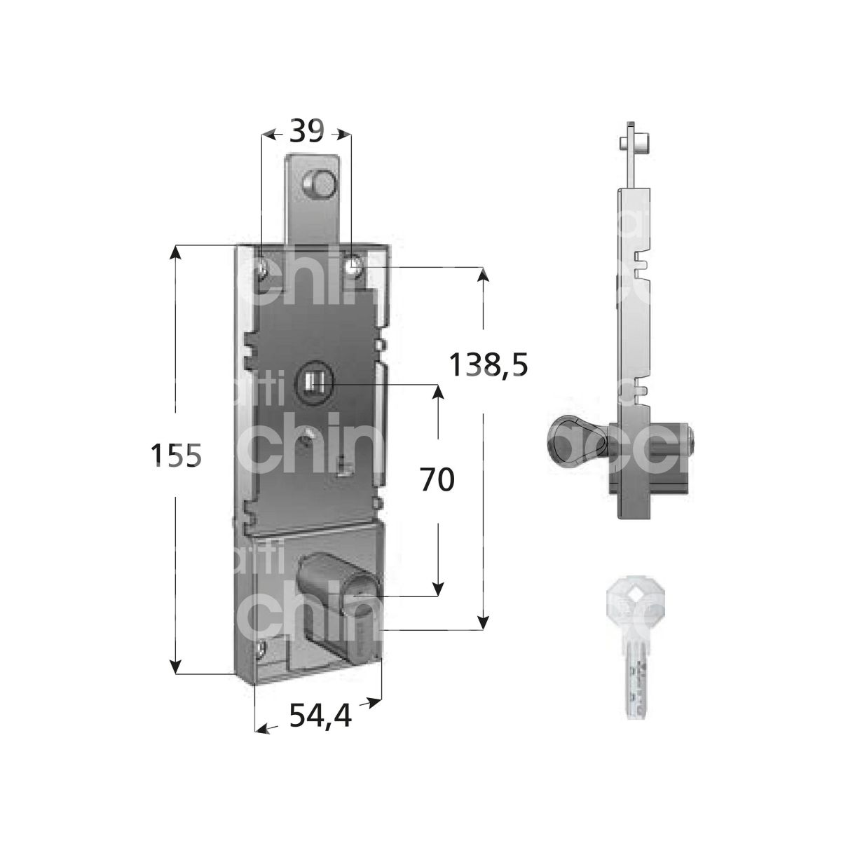 SERRATURA  PER PORTE BASCULANTI CON CILINDRO DI SICUREZZA CON POMOLO Cilindro sfilabile misura 27-10 Senza levetta di sbloccaggio interna con mezzo cilindro di sicurezza con pomolo Con quadro maniglia Ø 8 mm 2 chiavi Art. 7300.2A00.0000