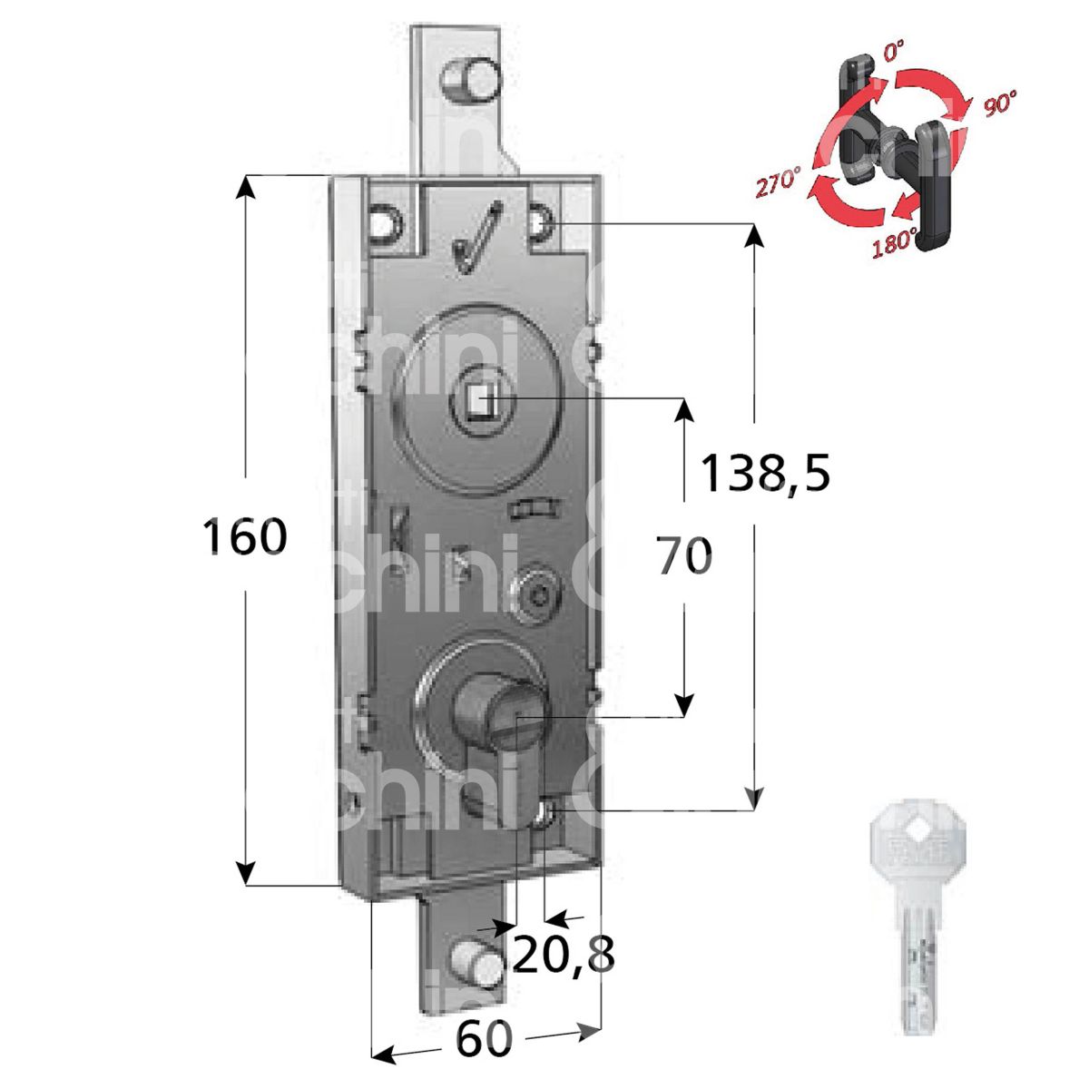 SERRATURA  PER PORTE BASCULANTI CON CILINDRO DI SICUREZZA Cilindro sfilabile misura 24-10 Con quadro maniglia Ø 8 mm Maniglia in folle brevettata a scatto a serratura chiusa la maniglia gira liberamente a scatti di 90° rendendo impossibile la forzatura Apertura con chiave dall'esterno e dall'interno con levetta di sblocco 2 chiavi Art. 7300.2A00.0000