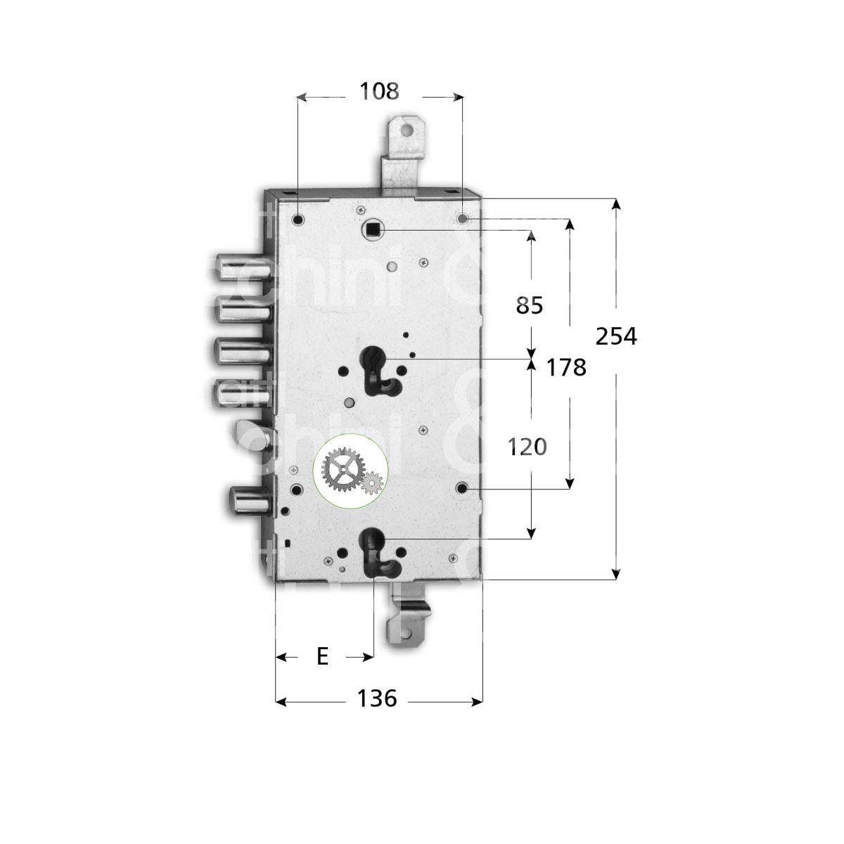 SERRATURA PLURISISTEMA art. 668GP Serie M serr. primaria: catenaccio e scrocco reversibile movimento ad ingranaggi serr. secondaria: indipendente 2 mandate e scrocco Cilindri sagomati non inclusi Aste non comprese
