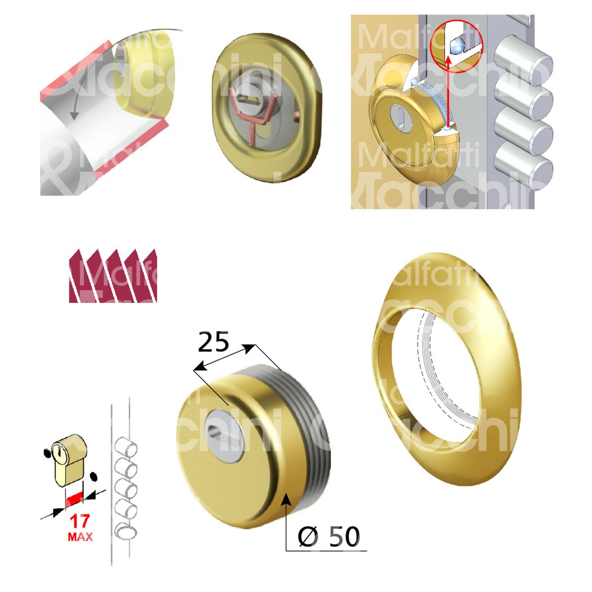 PROTETTORE SFERICK DIAMOND MONOLITO TOP Art. BKD270-25 Art. BKD370-25 Antistrappo Sistema Top Rotore D1 Antisketting di serie Protezione contro l'estrazione del barilotto Borchia di protezione con 4 sfere in acciaio per cilindro con copertura e placca antistrappo Spine in Widia