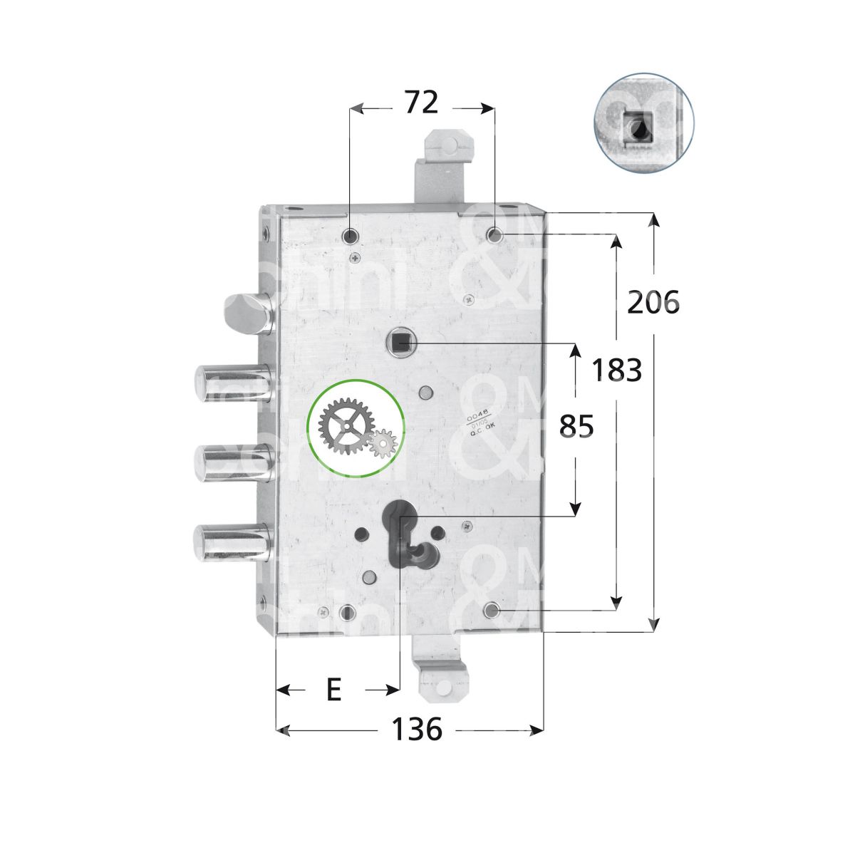 SERRATURA PER BLINDATE A cilindro ad ingranaggi Serie RCI Sporgenza catenacci 3,5 mm Scrocco reversibile, azionato dal quadro maniglia e dal cilindro Aste non comprese Cilindro non incluso