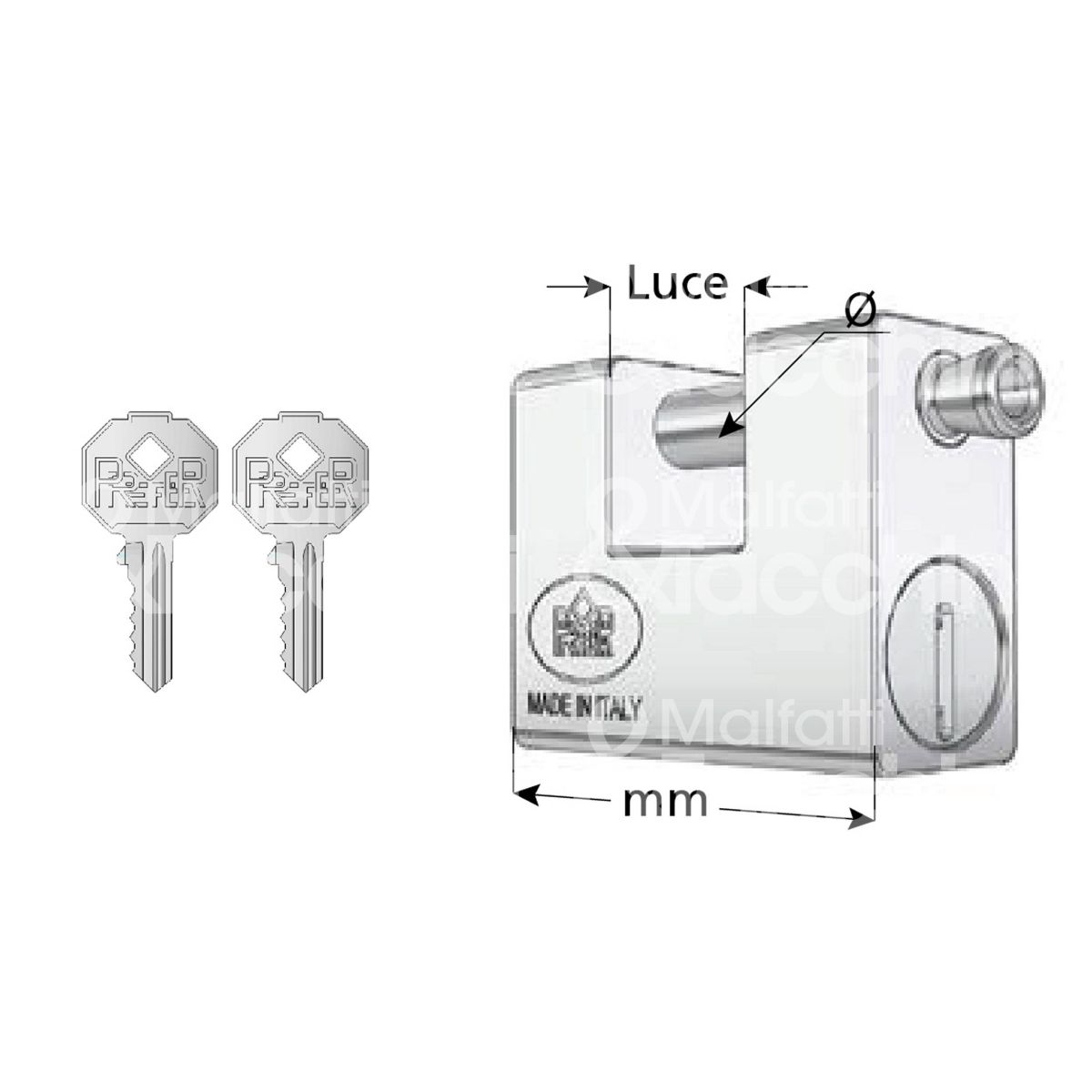 LUCCHETTO PREFER PER SERRANDA SERIE 6 PICCOLO Monoblocco in acciaio temperato Perni anti-bumping Protezione protettore 2 Chiavi piatte art. 7100.1500.0000