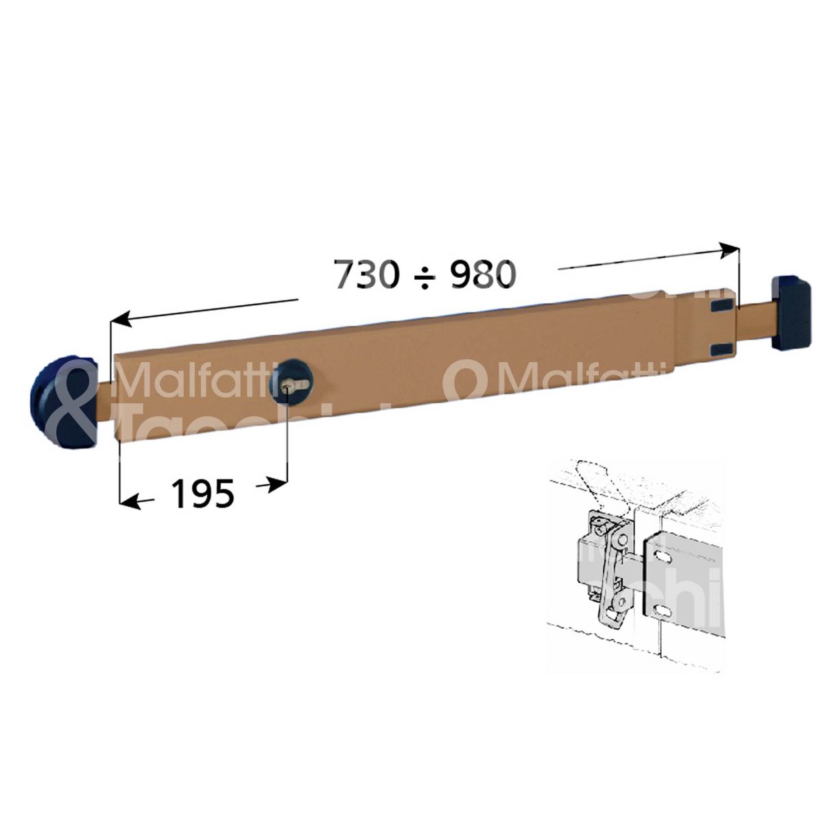 SPRANGA REGOLABILE CON DISPOSITIVO ANTI-AGGRESSIONE 98 cm accorciabile fino a 73 cm Corpo ricavato da un’unica lamiera in acciaio spessore 1,5 mm Catenacci sezione 40x10 mm Altissima resistenza alla flessione e all’attacco del grimaldello 2 mandate (con la prima mandata il catenaccio va ad impegnare il dispositivo anti-aggressione e la porta può rimanese socchiusa senza essere aperta) Cilindro di sicurezza viro con 4 chiavi in dotazione incluso
