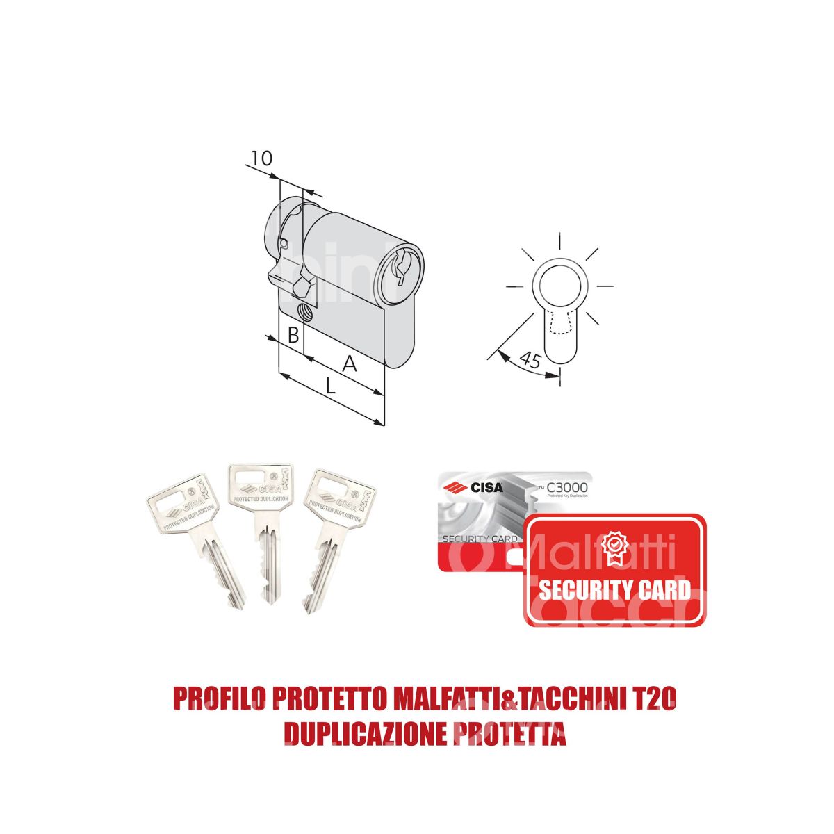 MEZZO CILINDRO SAGOMATO C3000 Ottone nichelato Elevata resistenza al trapano e al bumping Profilo riservato Malfatti&Tacchini T20 DUPLICAZIONE PROTETTA Camma regolabile in 14 posizioni 3 chiavi a profilo paracentrico con marchio 3D antiduplicazione illecita Security Card Per ulteriori informazioni contattare l'agente di zona