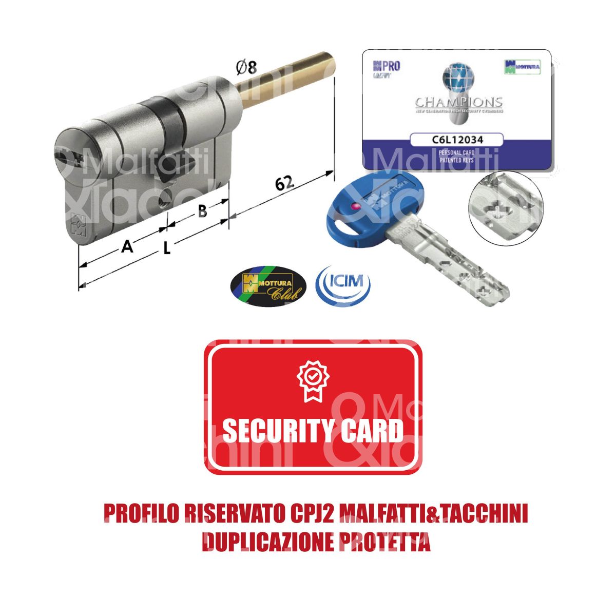 CILINDRO DI SICUREZZA PREDISPOSTO POMOLO RASABILE CHAMPIONS PRO Finitura: nichelato Profilo riservato CPJ2 Malfatti&Tacchini DUPLICAZIONE PROTETTA Sezione ridotta per una rottura controllata in caso di effrazione. Controlli profilo "in asse" sagomati antipicking, bumping, tracing. Alta resistenza alla perforazione 3 chiavi in dotazione Chiave con profilo brevettato MM vendibile e duplicabile solo presso i centri autorizzati Malfatti&Tacchini Security Card Per ulteriori informazioni contattare l'agente di zona