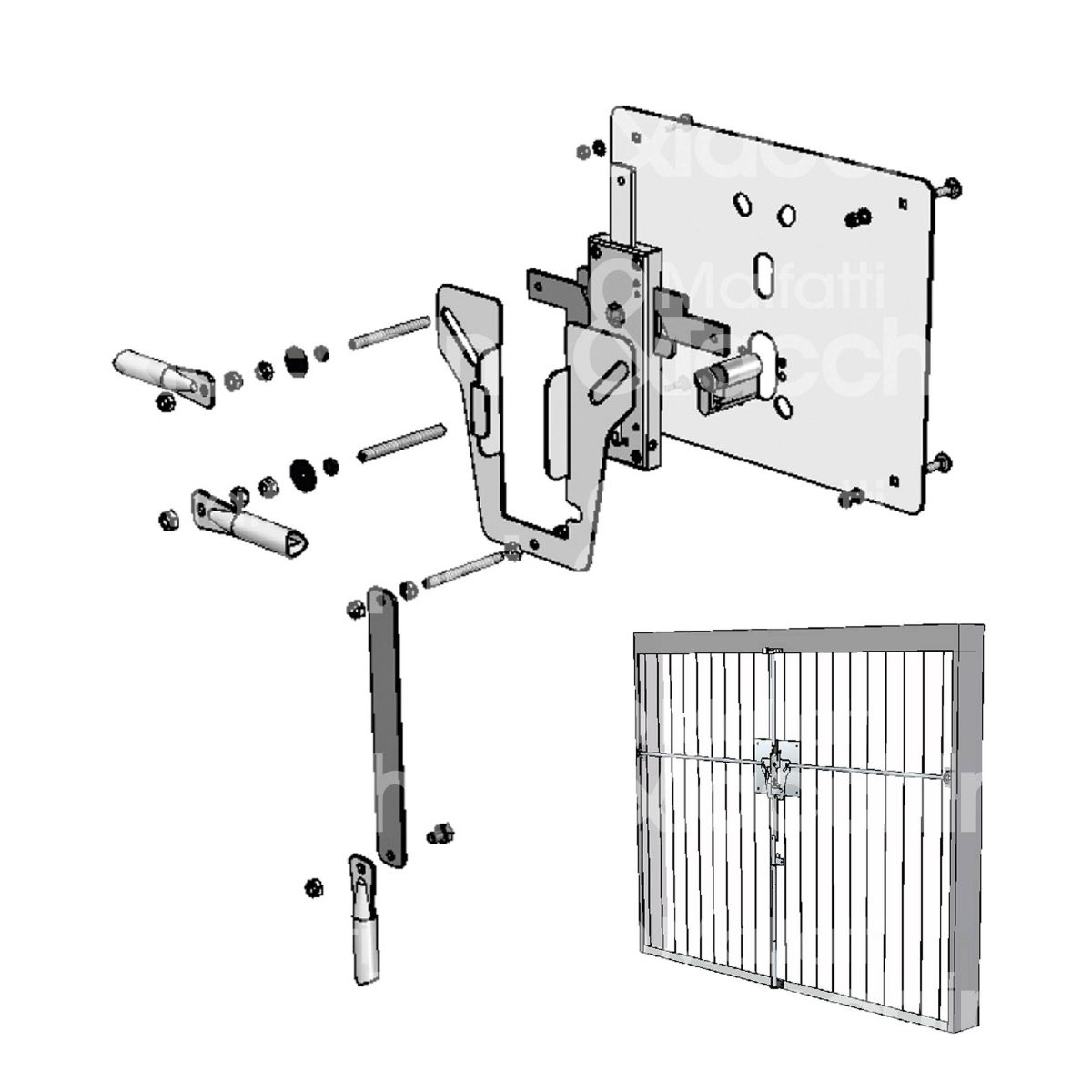 KIT SICUREZZA BASCULANTI Kit completo composto da: Serratura con 3 catenacci diritti Cilindro di sicurezza con sistema anti-bumping e antigrimaldello e 2 chiavi piatte. Piastra deviatore a 4 vie (corsa 24 mm) Pozzetto a pavimento Ø 22 mm Squadretta guida aste terminali per pistone Ø 18 mm Piastra di sicurezza interna 300x240x2 mm Asta terminale con ghiera regolabile 800-1370 attacco Ø 8 mm Asta prolunga
