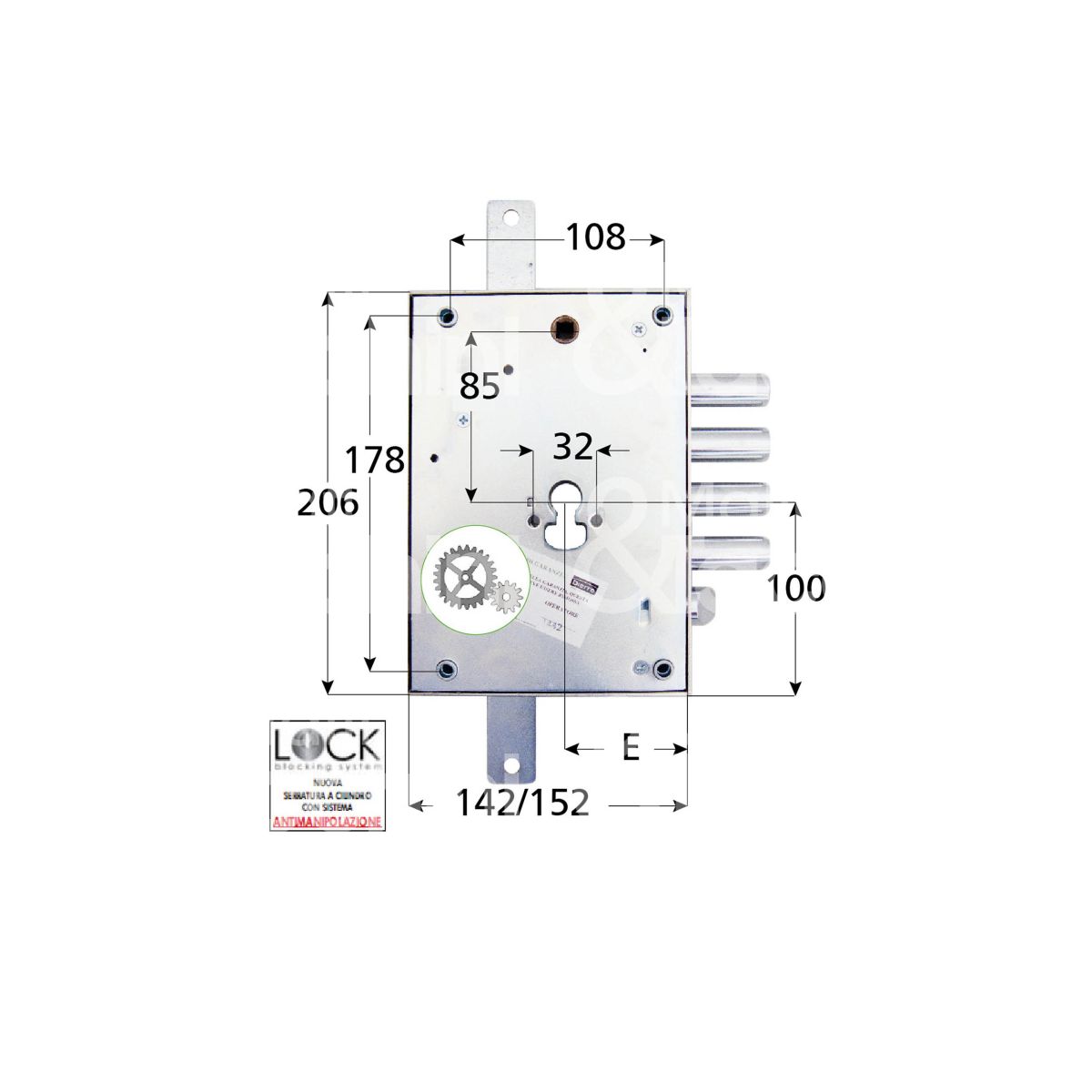 Serie HEAVY CYLINDRO Serr. triplice a cilindro applicare 3 mandate ad ingranaggi Maniglia in folle scrocco azionato da quadro maniglia e chiave DISPOSITIVO ANTI-EFFRAZIONE LOCK BLOCKING SYSTEM Kit per montaggio cilindro Mostrine non incluse Confezione industriale