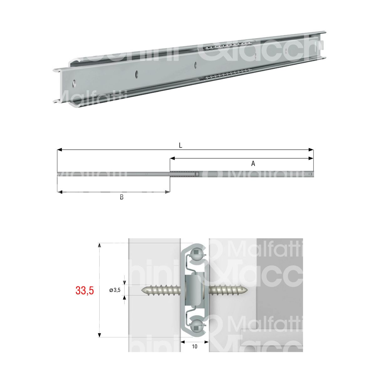 GUIDA A SFERE PER CASSETTO SERIE 851 Fissaggio laterale/orizzontale Estrazione parziale Portata max coppia 30 Kg La portata massima si riferisce al carico massimo consentito per coppia di guide (500 mm) con montaggio laterale Sezione C = 33,5 mm Foratura passo 32 mm Viti Ø 3,5 mm Finitura zincata