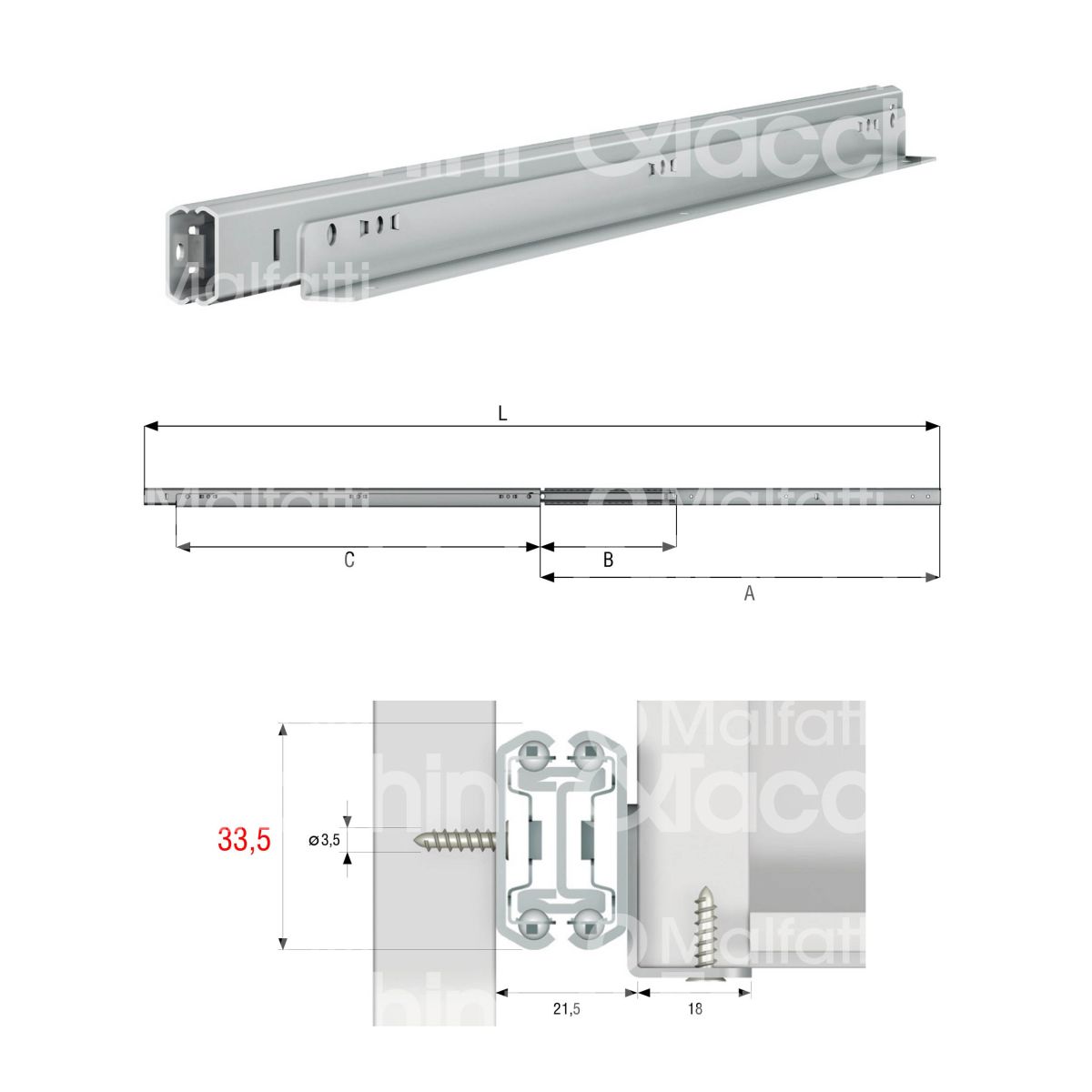 GUIDA A SFERE PER CASSETTO SERIE 860 Fissaggio al fondo Estrazione totale Portata max coppia 30 Kg La portata massima si riferisce al carico massimo consentito per coppia di guide (550 mm) Sezione C = 33,5 mm Foratura passo 32 mm Viti Ø 3,5 mm Finitura zincata
