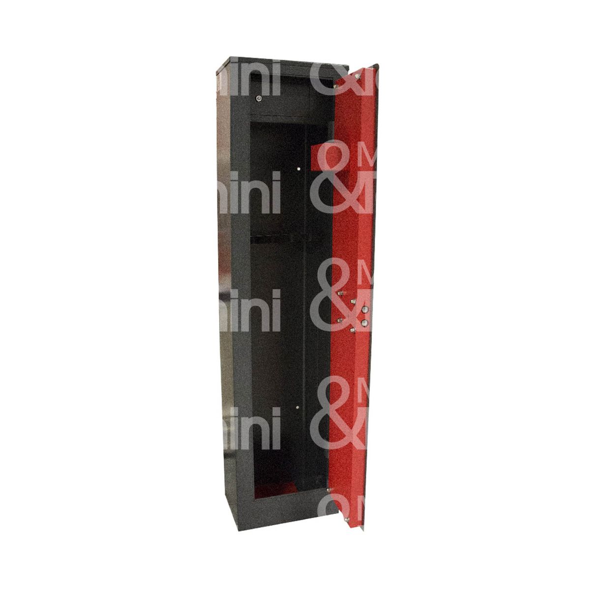 ARMADIO PORTAFUCILI Due chiavi Predisposto con quattro fori, due in alto e due in basso per un fissaggio ottimale Tesoretto porta proiettili/portaoggetti dotato di serratura Base con tappetino d'appoggio Sportello con  cassettino Colore esterno grigio Colore interno rosso 3 Posti: 40 kg 5 Posti: 55 kg 8 Posti: 63,5 kg