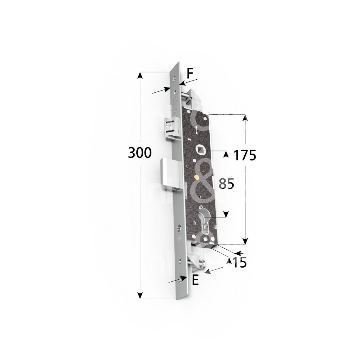 SERRATURA DI SICUREZZA PER MONTANTI Triplice Catenaccio avanzante e scrocco regolabile, reversibile e intercambiabile con il rullo 01435 Cassa stretta 15 mm Frontale Inox 2 borchie 1 sottofrontale Cilindro sagomato non incluso Aste non comprese