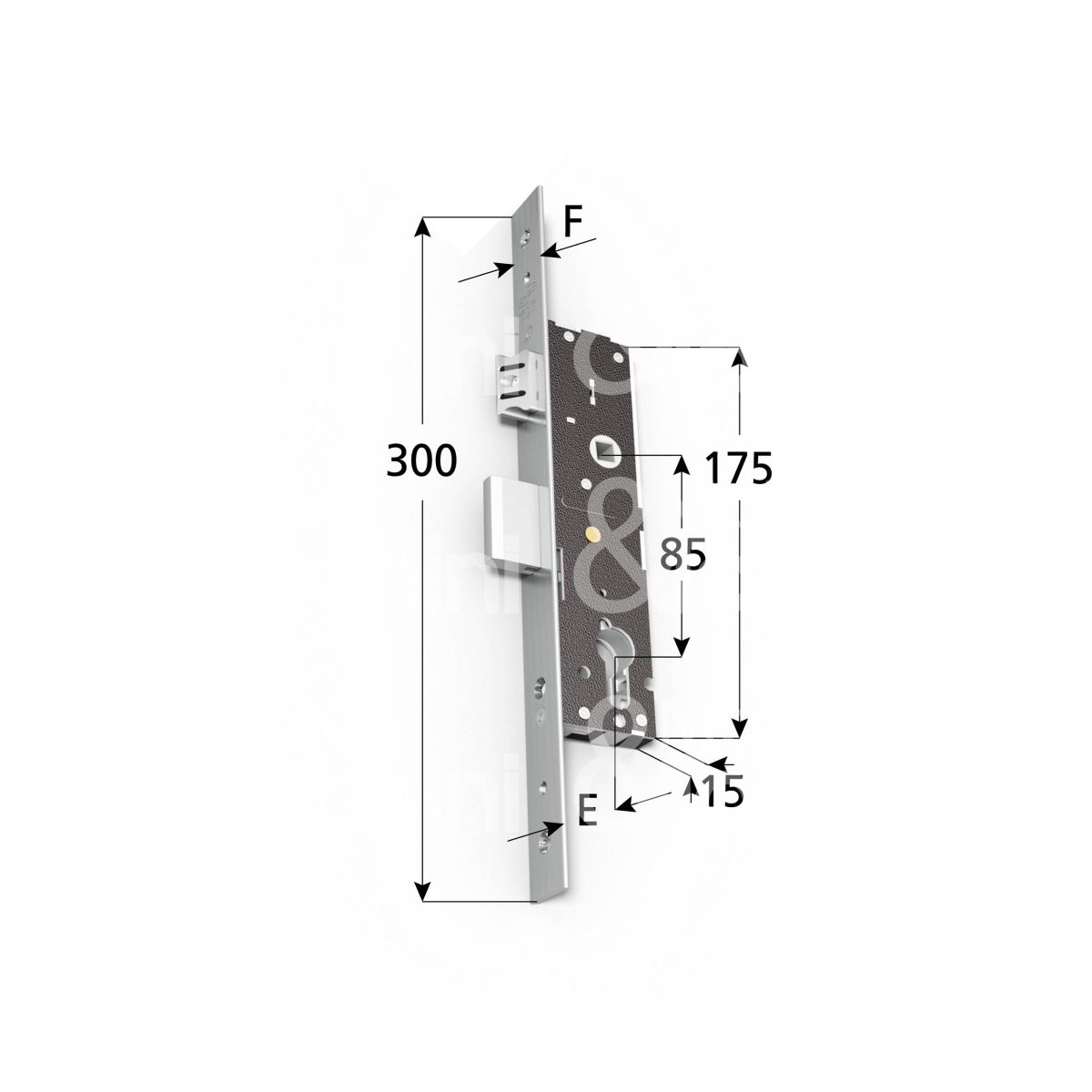 SERRATURA DI SICUREZZA PER MONTANTI Catenaccio avanzante e scrocco regolabile, reversibile e intercambiabile con rullo 01435 Cassa stretta 15 mm 2 borchie 1 sottofrontale Fronale Inox Cilindro sagomato non incluso