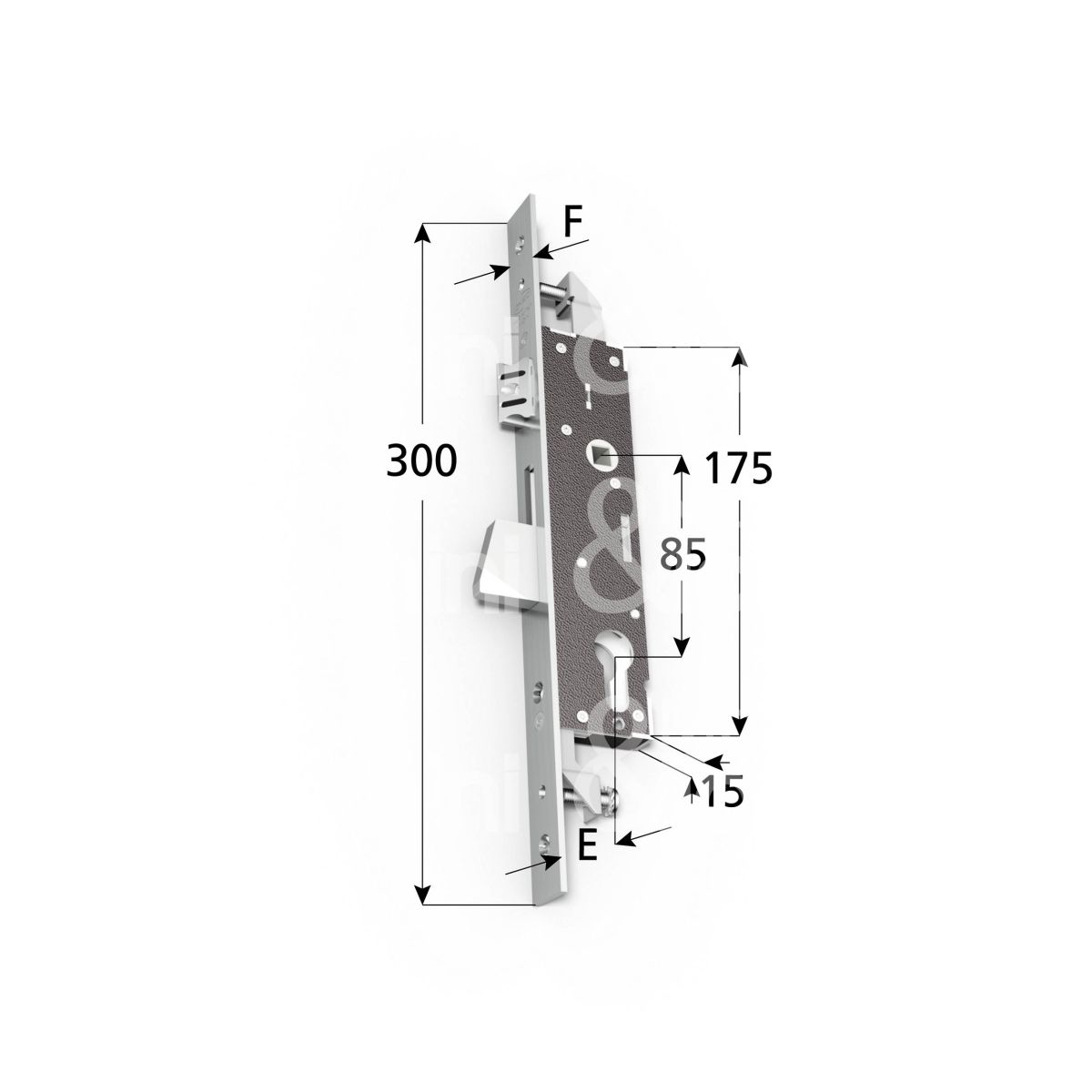 SERRATURA DI SICUREZZA PER MONTANTI Triplice Catenaccio basculante e scrocco regolabile, reversibile e intercambibilecon rullo 01435 Cassa stretta 15 mm Frontale Inox 2 borchie 1 sottofrontale Cilindro sagomato non incluso
