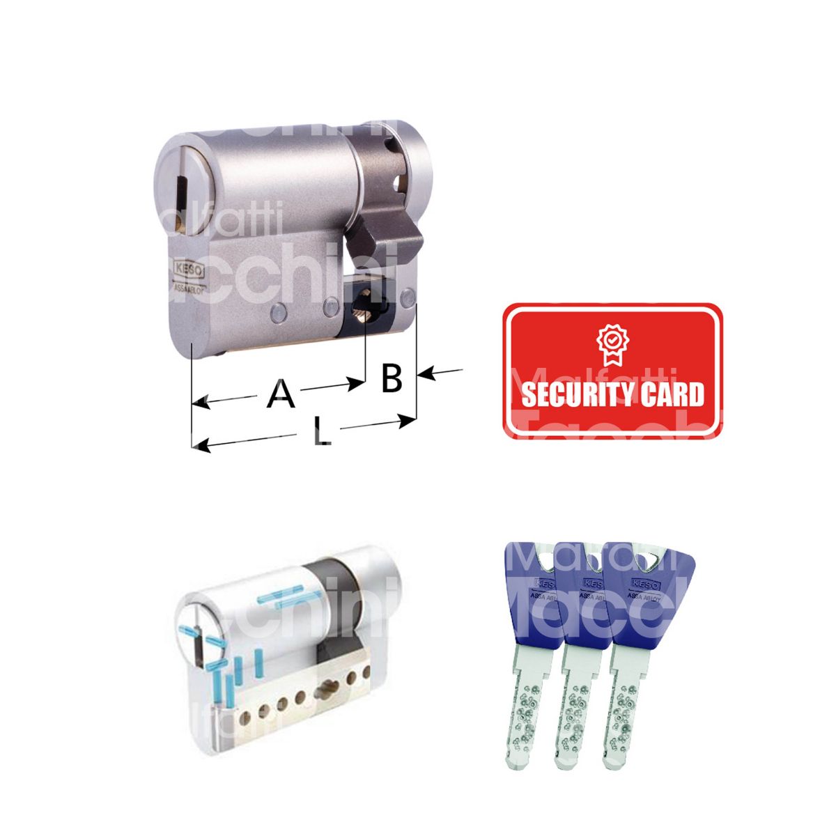 MEZZO CILINDRO KESO 8000 PROFILO RISERVATO KESO Finitura nichel satinato Testina esterna tipo "C" con barra in ottone Certificato VdS B 3 chiavi Security Card