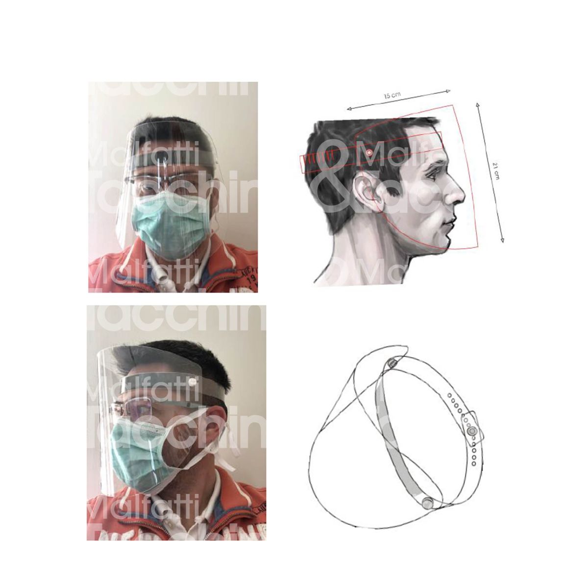 VISIERA PROTETTIVA Protegge completamente il viso da spruzzi, schizzi, acqua e aria Materiale PET Sostenuta da una fascia trasparente regolabile in larghezza (9 misure) Misure: 21x30 cm Non è un dispositivo medico  D.P.I Da montare