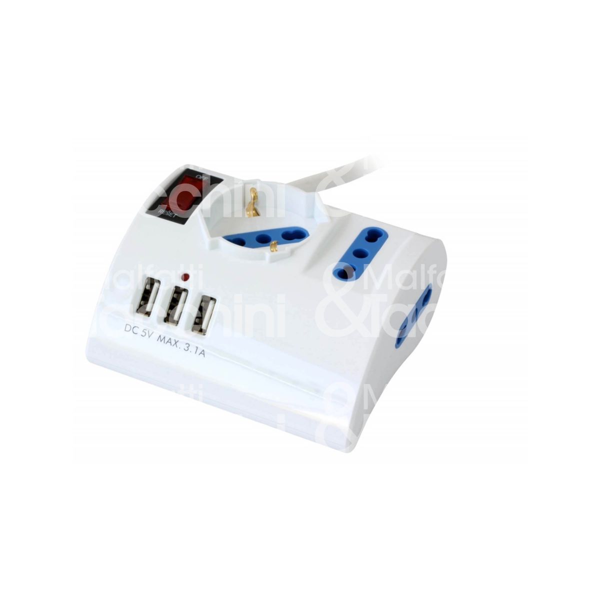 M&t 900 88823 multipresa 6 posti con interruttore art. 8024 bianco uscite frontali 1 presa 2p+t 16a bipasso/schuko 1 presa 2p+t 16a bipasso - uscite laterali 3 porte usb - 1 presa 2p+t bipasso cavo 1,5 mt. spina 2p+t 10a limitatore termico sovraccarico