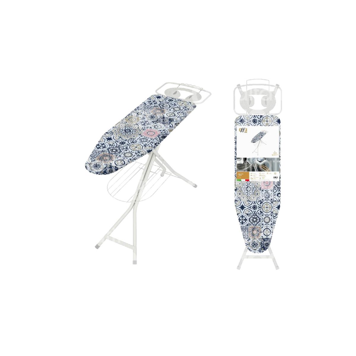 ASSE DA STIRO Modello Trento Misura:120x40 cm Regolazione altezza in 6 posizioni fino a 95 cm Poggiaferro portacaldaia con inserti in silicone Barra portagrucce Griglia portabiancheria rinforzata fusto ad alta stabilità Ø28 mm Foderina 100% cotone Taglia L Colori assortiti Made in Italy