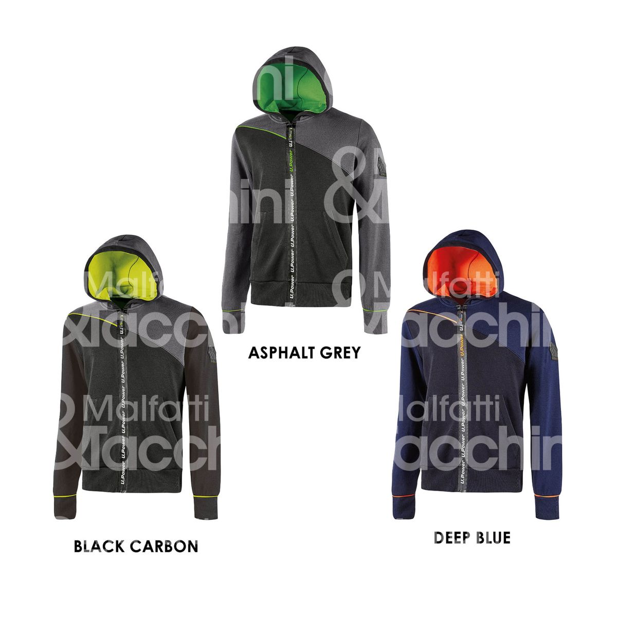 FELPA JUPITER Felpa con cappuccio regolabile Chiusura con zip centrale con serigrafia "U-Power" Tasche ad ingresso obliquo Polsi e fondo a coste elasticizzate Composizione: 70% cotone, 30% poliestrere - 310 gr/mq