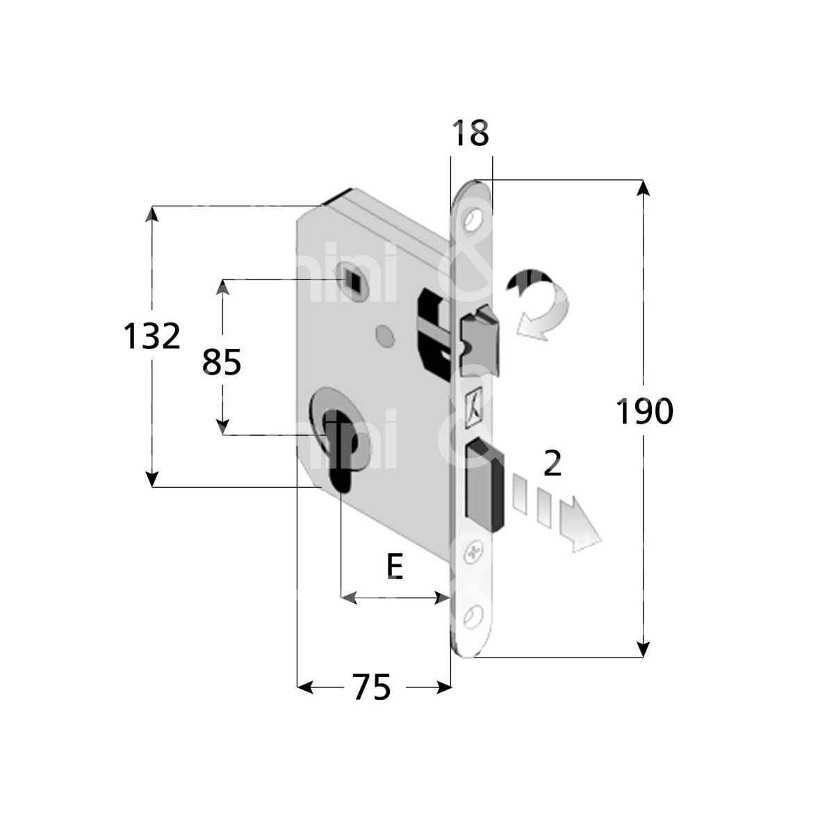 SERRATURA MECCANICA A CILINDRO Mod. 290 - 2001 Bordo tondo Int. 85 Scrocco reversibile 2 mandate Quadro maniglia 8 Cilindro non compreso
