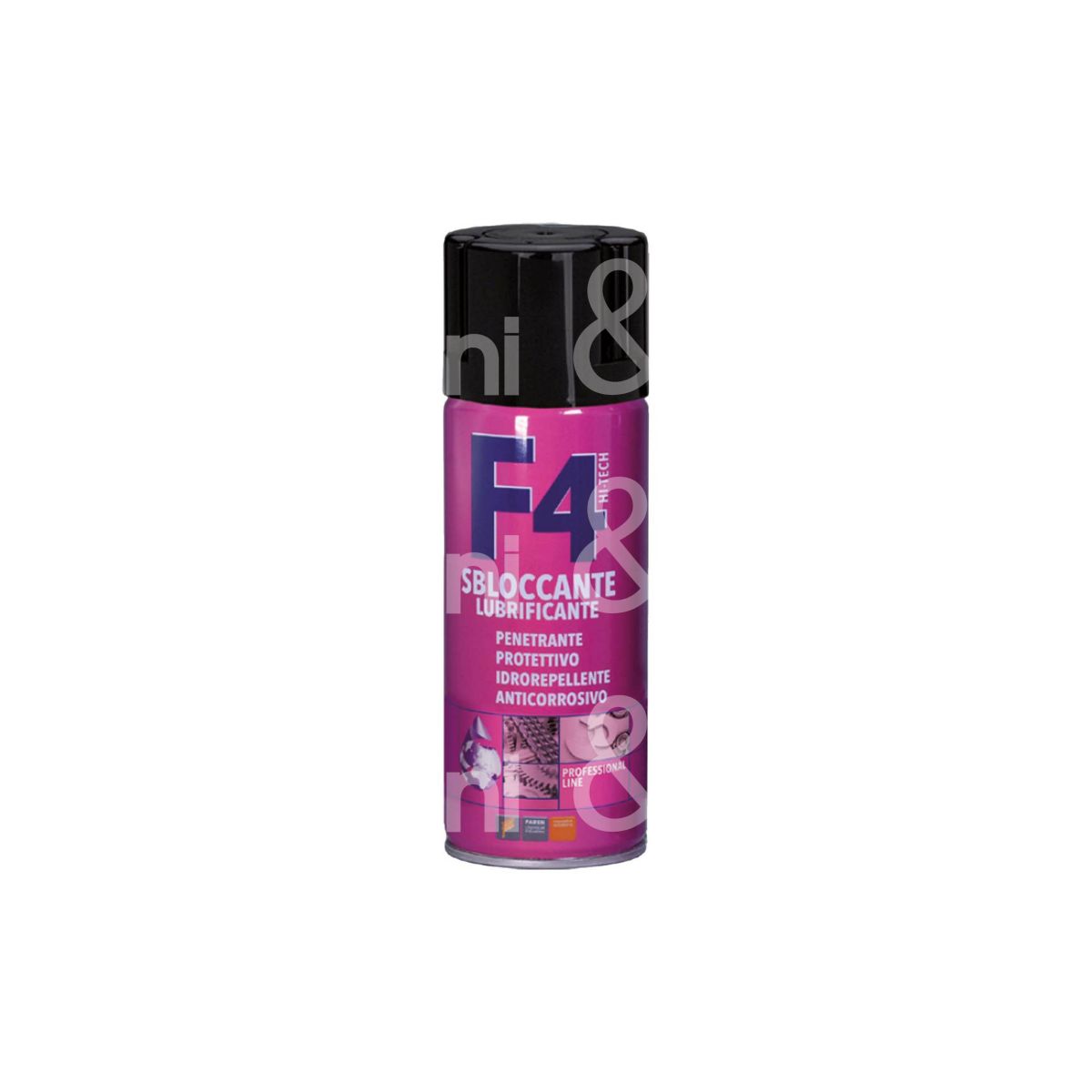 SBLOCCANTE MULTIUSO - LUBRIFICANTE F4 Penetrante, protettivo, idrorepellente e anticorrosivo. Sblocca e lubrifica dadi, bulloni, serrature e meccanismi da ruggine, ossidazioni e gelo. Protegge e lubrifica metalli, macchinari, attrezzature, motori, parti elettriche, ingranaggi, catene e guarnizioni Formato 400 ml