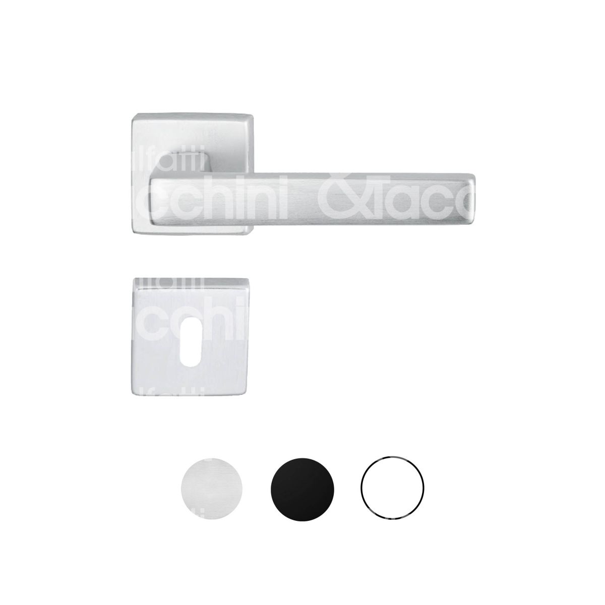 GUARNITURA MANIGLIA Mod. ACAPULCO Con rosette e bocchette quadre 50 mm Foro patent Lunghezza maniglia 125 mm